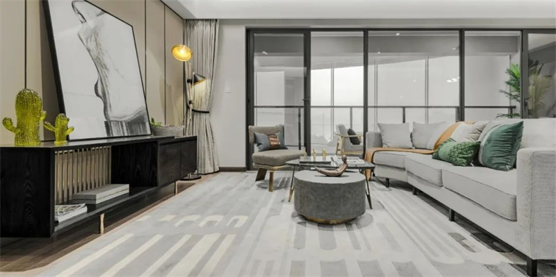 本案采用灰白中性色搭配原木地板為主色調,營造清新簡約的空間氛圍。室內家具選用了簡約設計的灰白色系,搭配金屬材質的細節裝飾與綠植,使整體空間更顯現現代感和奢華感。